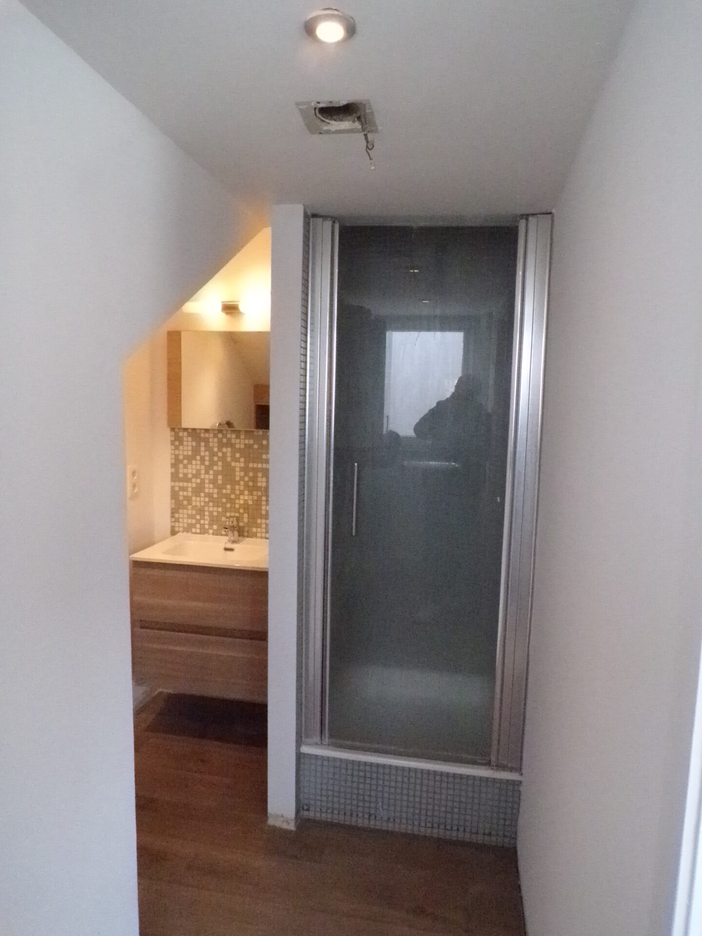 Composition / grand séjour avec une cuisine équipée une chambre une salle de douche avec wc douche et lavabo. Chauffage centrale gaz chassis PVC DV parquet aux sols. Separation d'énergies (eau gaz électricité).