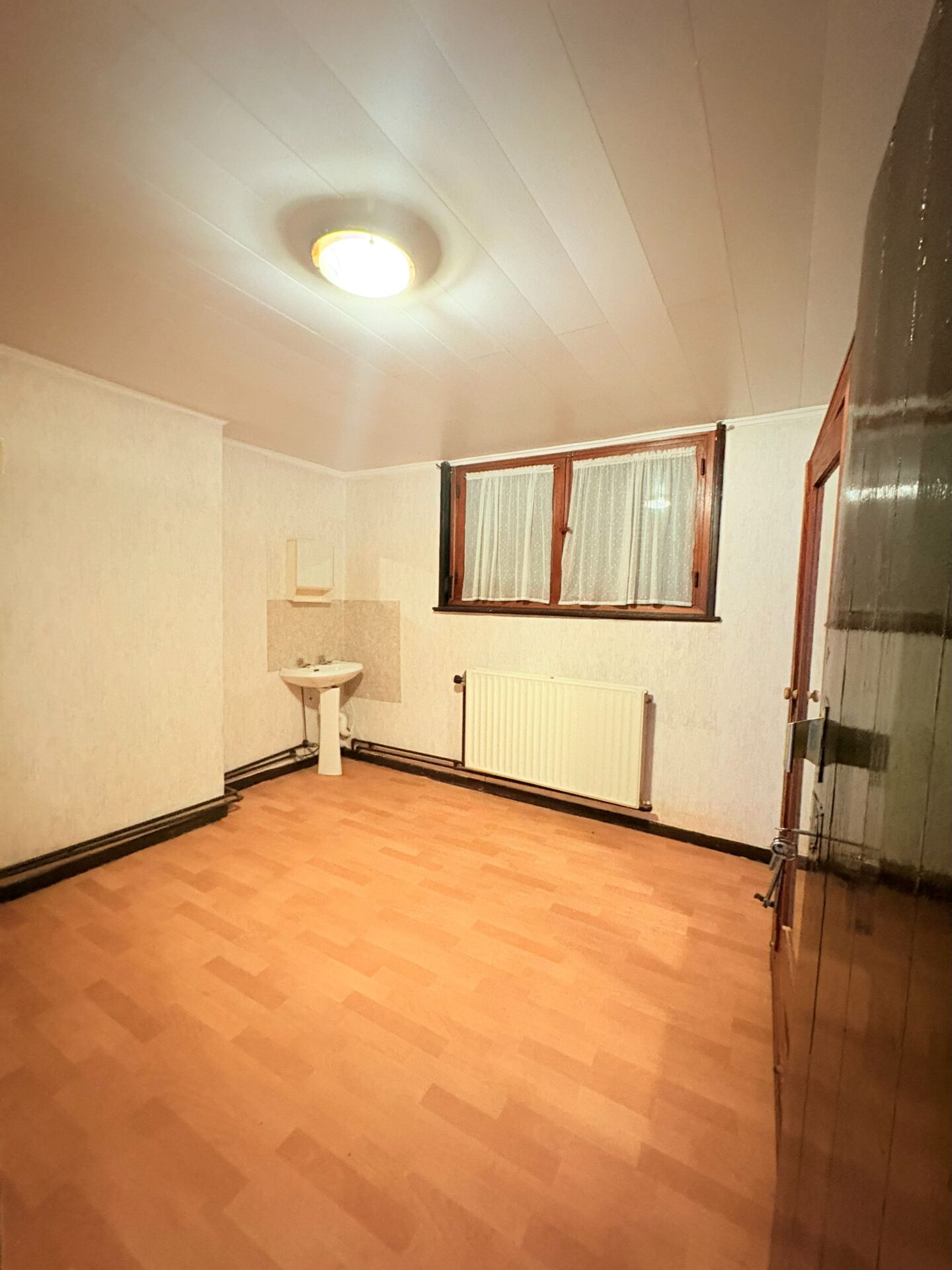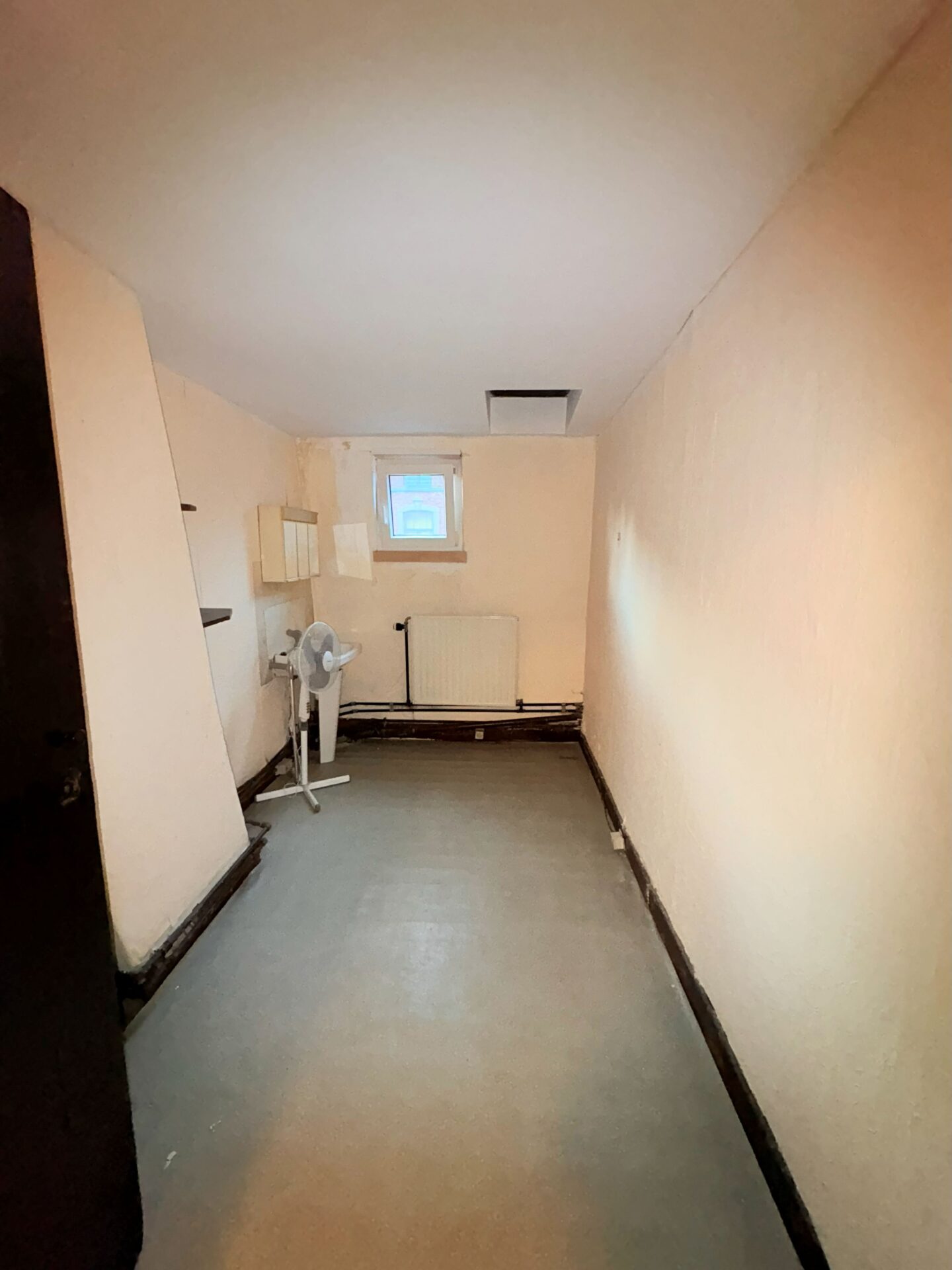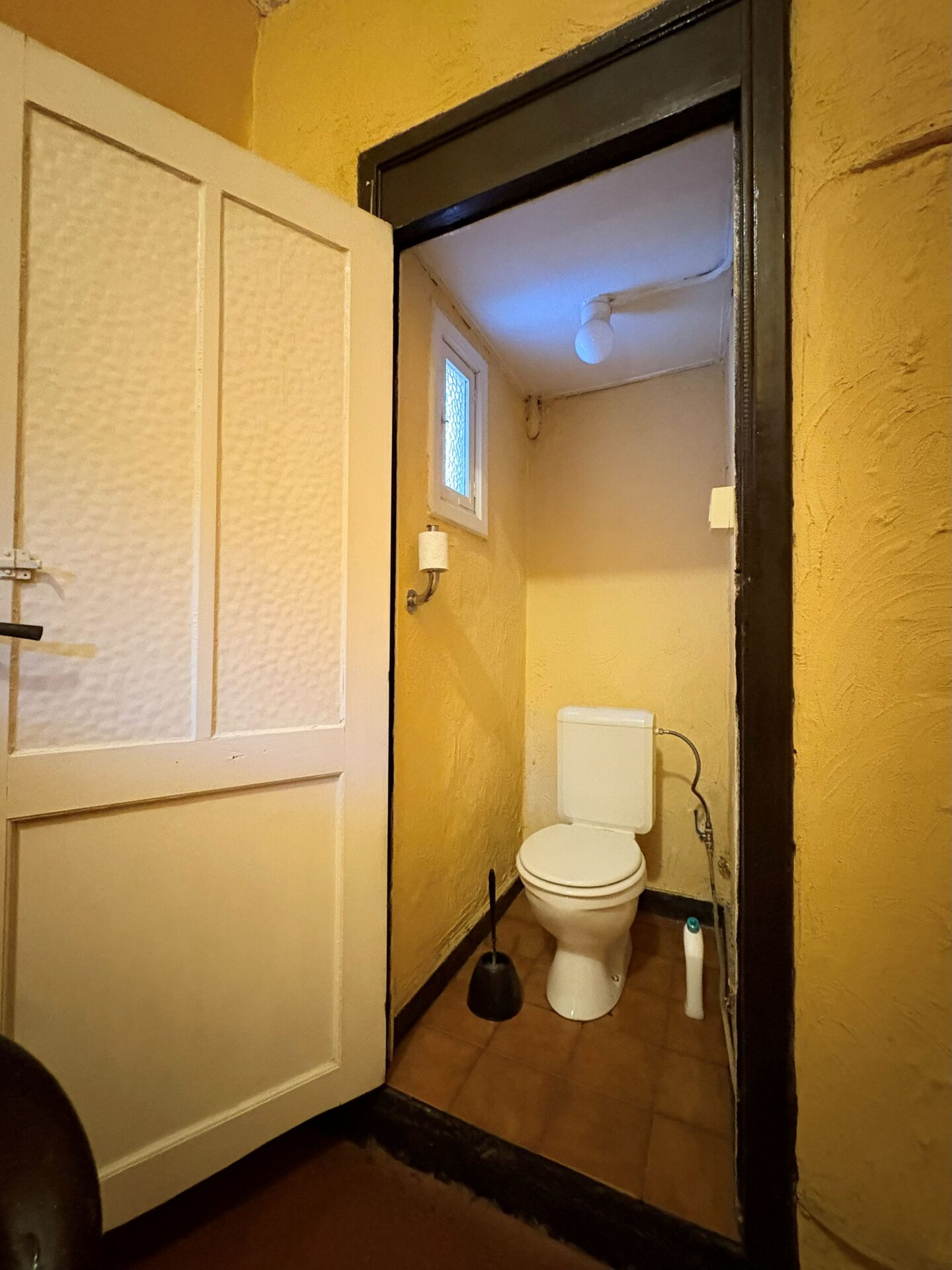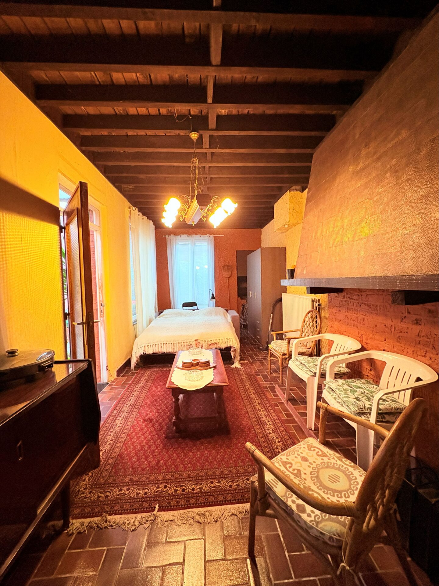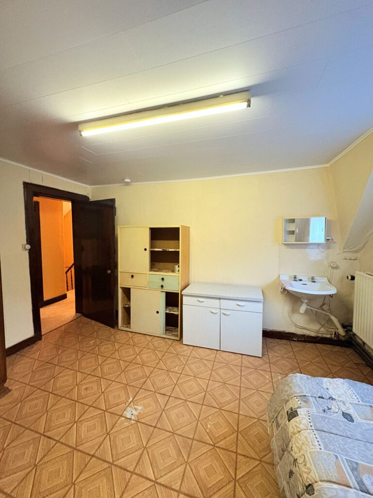 Le rez-de-chaussée se compose d’un grand séjour avec cuisine séparée, occupant l’ancienne salle du restaurant. À l’arrière, vous découvrirez une agréable cour extérieure, idéale pour profiter du calme en plein cœur de la ville. Une annexe attenante, actuellement aménagée en grande chambre, dispose d’une salle de douche et d’un WC séparé.