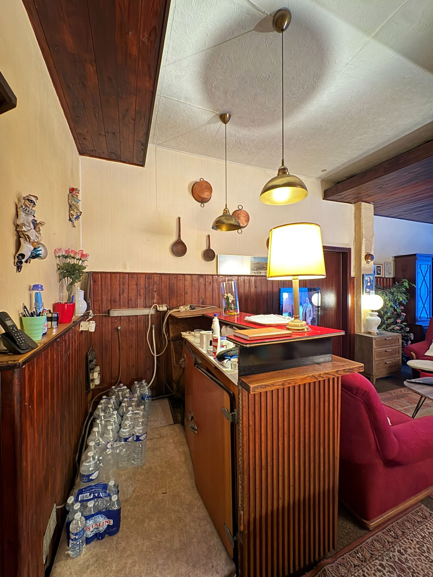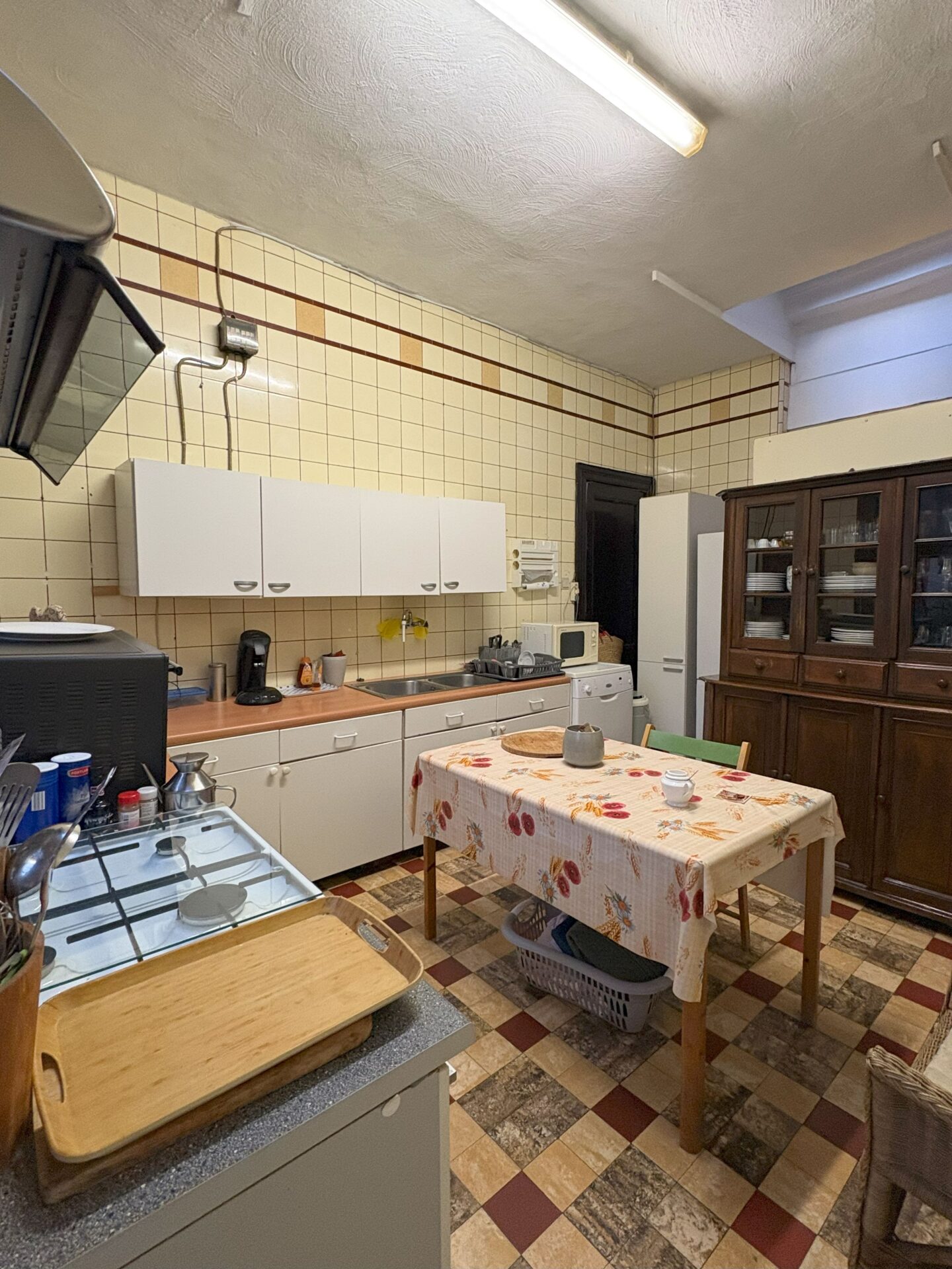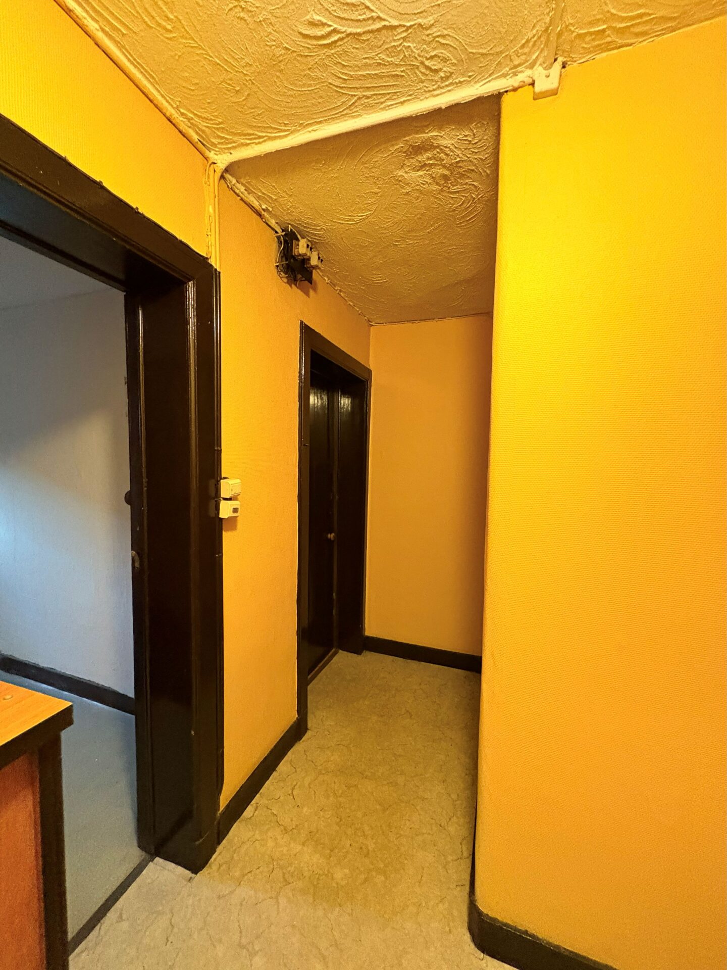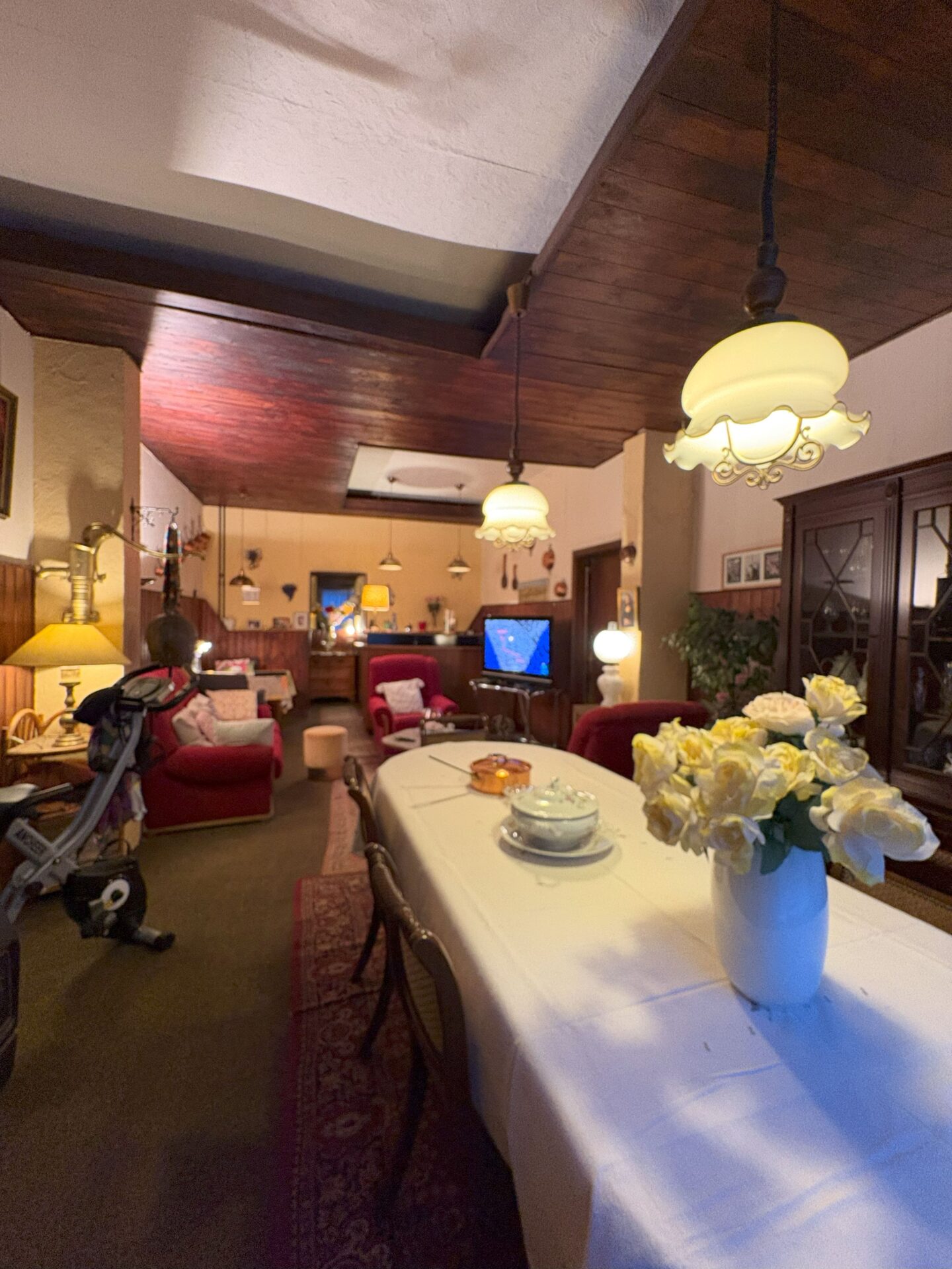 Le rez-de-chaussée se compose d’un grand séjour avec cuisine séparée, occupant l’ancienne salle du restaurant. À l’arrière, vous découvrirez une agréable cour extérieure, idéale pour profiter du calme en plein cœur de la ville. Une annexe attenante, actuellement aménagée en grande chambre, dispose d’une salle de douche et d’un WC séparé.
