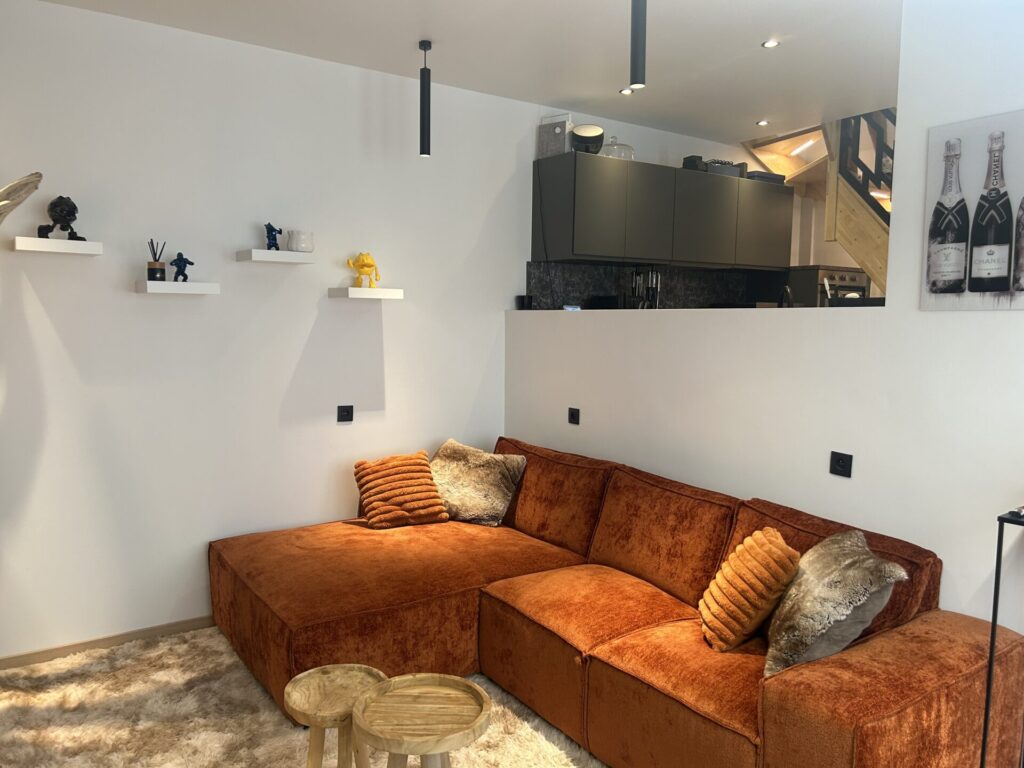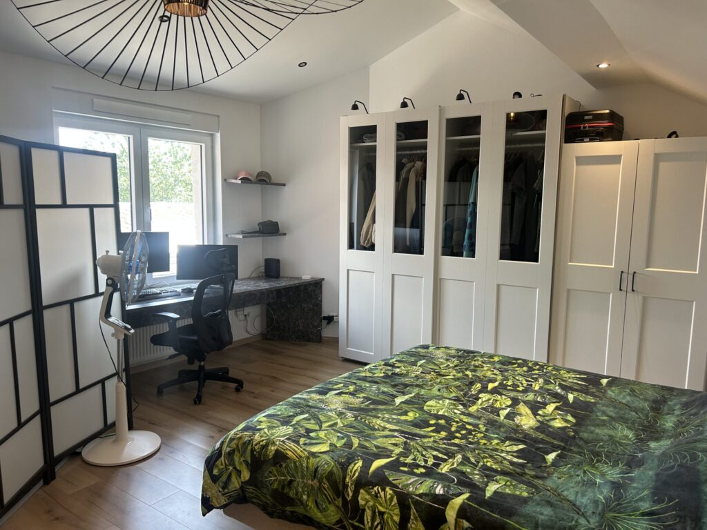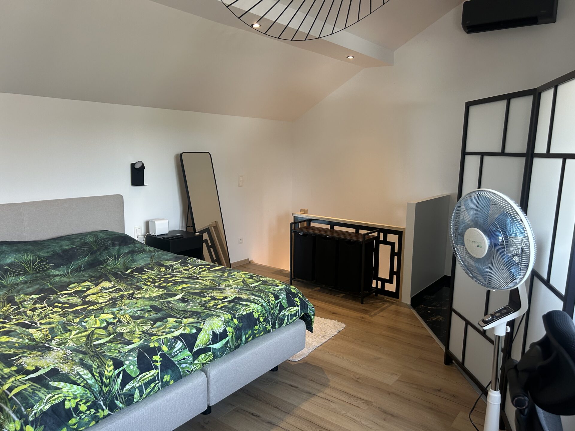Elle offre un séjour lumineux, une cuisine entièrement équipée, un WC séparé et une penderie. À l’étage se trouve une grande chambre avec salle de bain ouverte avec wc.