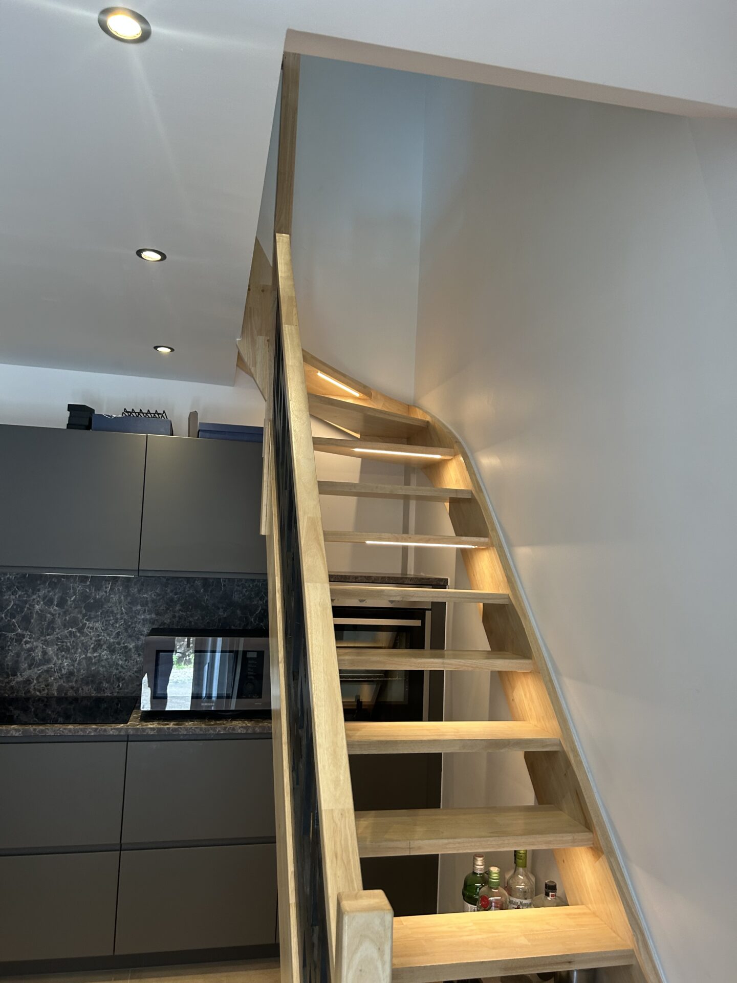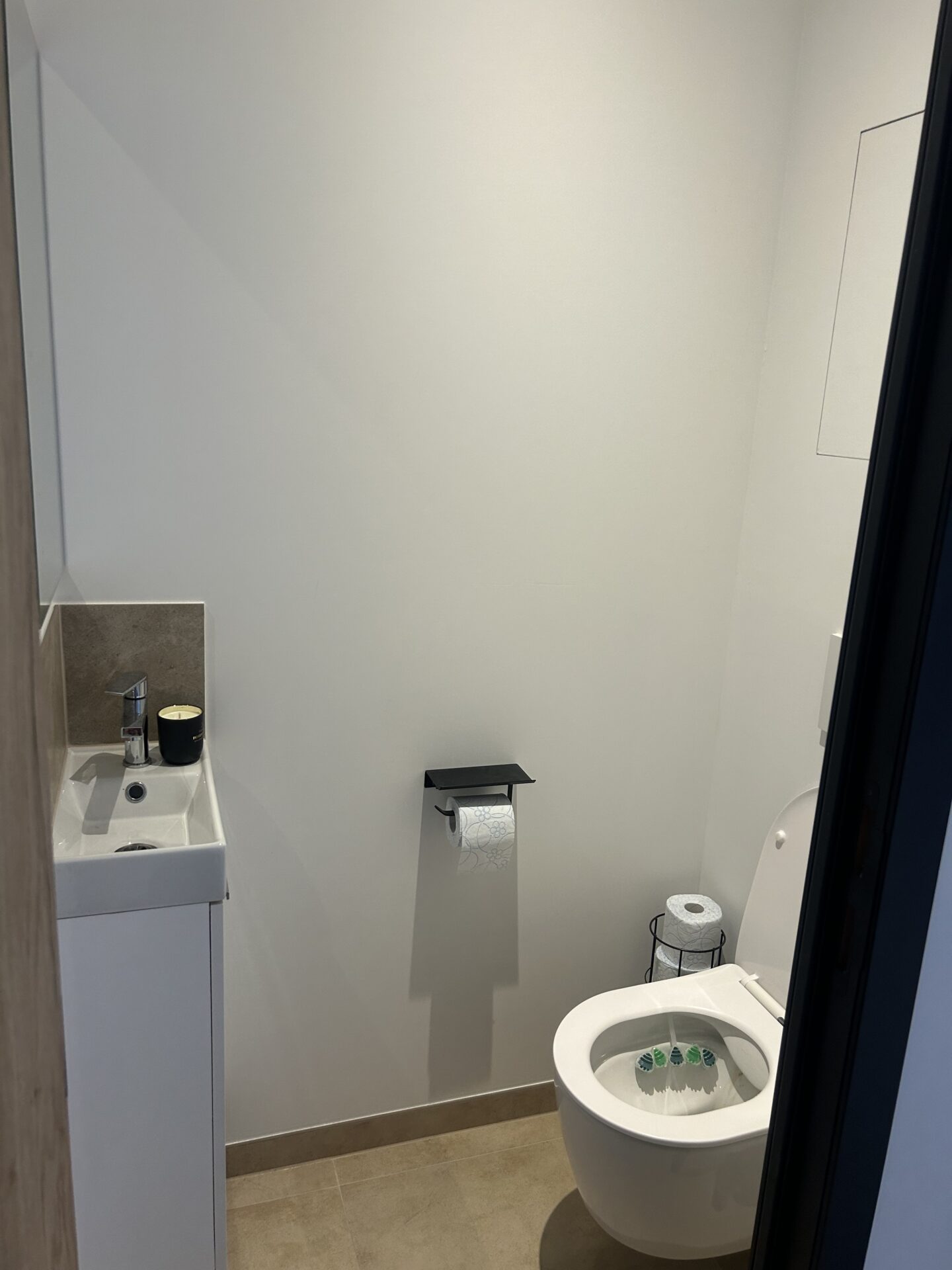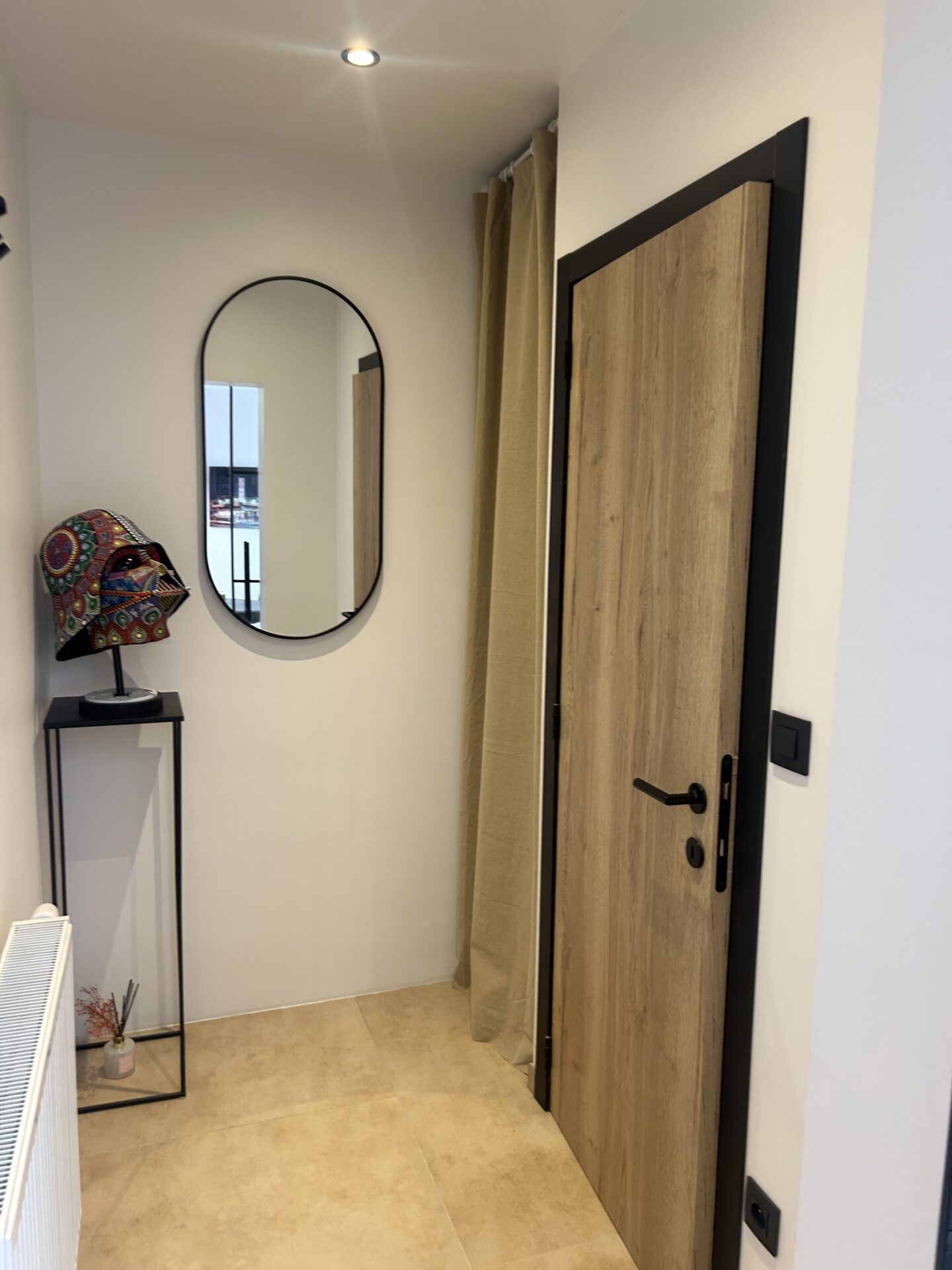 Elle offre un séjour lumineux, une cuisine entièrement équipée, un WC séparé et une penderie. À l’étage se trouve une grande chambre avec salle de bain ouverte avec wc.
